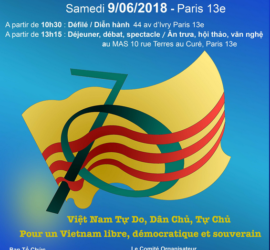 Le Samedi 9 Juin 2018, conjointement avec de nombreuses associations de la communauté vietnamienne en France, l’AGEVP organise l’anniversaire des 70 ans du Drapeau Jaune du Vietnam Libre. Aujourd’hui, pour des millions de Vietnamiens, ce drapeau est le symbole de la Liberté, la Démocratie et la Souveraineté. ll est le refus de toute ingérence étrangère, du gouvernement de la Chine populaire actuellement. Il est un des symboles de l’opposition démocratique et du respect des […]