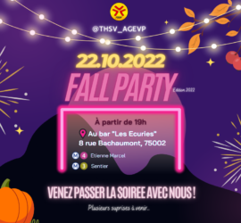 ❗️🍁 🍂 Soirée de rentrée TH❗️🍂 🍁 L’AGEVP à l’honneur de vous inviter à sa FALL PARTY édition 2️⃣0️⃣2️⃣2️⃣ pour lancer le début d’une nouvelle période de festivités ! 🎉🕺💃 🎉 Plusieurs surprises au programme avec la chance de gagner une place pour la prochaine soirée de l’AGEVP ! 🗓️ Samedi 22 Octobre à partir de 19h et jusqu’au bout de la nuit pour les plus fous ! 📍A “les Écuries Bar” : 8 rue […]