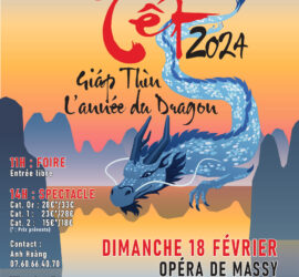 Pour célébrer l’année du Dragon de bois, l’Association Générale des Etudiants Vietnamiens de Paris vous convie comme à son habitude à son Festival du Nouvel An Vietnamien : Le dimanche 18 février 2024 de 11h à 18h à l’Opéra de Massy1 place de France, 91300 Massy Au programme : A partir de 11h ~ Venez profiter de la FOIRE ~ ▪ Défilé de tuniques vietnamiennes, 👘▪ Traiteur vietnamien, 🍜 ▪ Stands de jeux traditionnels pour découvrir le Vietnam et la richesse de […]