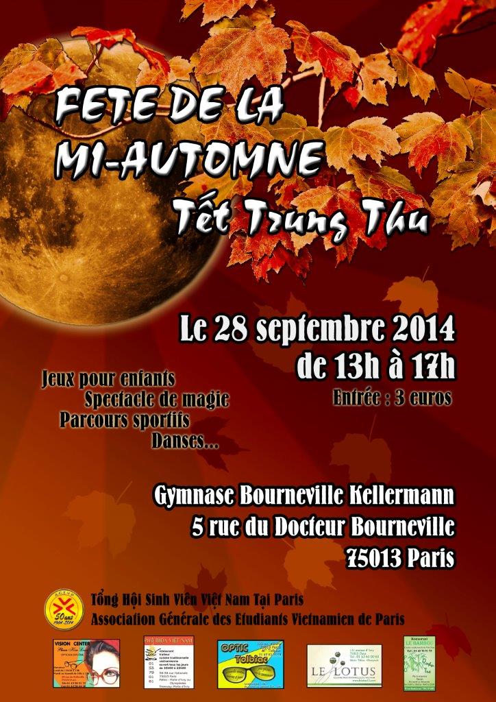 Cette année encore, l’Association Générale des Etudiants Vietnamiens de Paris organise la fête des enfants, aussi appelée Fête de la mi-automne ou encore Têt Trung Thu. La fête se déroulera au : Gymnase Bourneville-Kellermann 5 rue du Docteur Bourneville 75013 PARIS Le 28 septembre 2014 de 13h à 17h Au programme : jeux, parcours sportifs, spectacles de magie, chants, danses, … Une participation de 3€ est demandée par enfant et comprend un welcome pack contenant […]