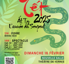 Pour célébrer l’année du Serpent, l’Association Générale des Etudiants Vietnamiens de Paris vous convie comme à son habitude à son Festival du Nouvel An Vietnamien : Le dimanche 16 février 2025 de 11h à 18h au Théâtre de Yerres2 Rue Marc Sangnier, Yerres, France Au programme : A partir de 11h ~ Venez profiter de la FOIRE ~ ▪ Défilé de tuniques vietnamiennes, 👘▪ Traiteur vietnamien, 🍜 ▪ Stands de jeux traditionnels pour découvrir le Vietnam et la richesse de sa culture, 🎲▪ Chants […]